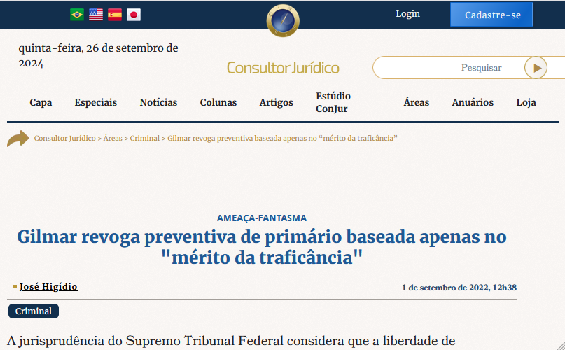 Ministro Gilmar Mendes do STF Concede Habeas Corpus Homem Preso em Flagrante por Tráfico de Drogas, Resistência, Desobediência e Tentativa de Homicídio Contra Policiais.