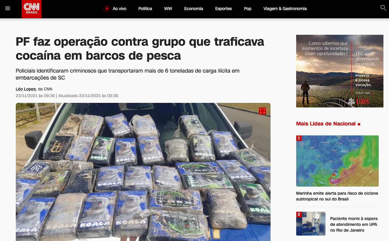 A Polícia Federal deflagrou a Operação Mar Aberto, desarticulando uma organização criminosa de tráfico internacional de cocaína. O grupo usava três embarcações de pesca de Itajaí (SC) para transportar toneladas da droga. A ação expôs a logística marítima empregada pelo esquema.